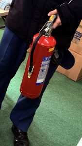 今回は周囲に開けた場所がない為消防士さんの判断で水入りの消火器を使った消火練習はせずに消火器の扱い方の説明のみを行っていただきました。